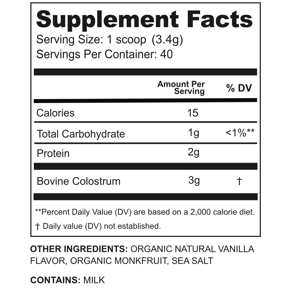 Vanilla: Grass-fed Bovine Colostrum, Organic Natural Vanilla Flavor, Organic Monk Fruit Extract, Sea Salt.