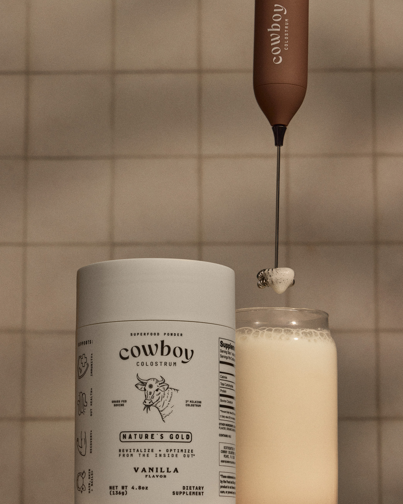 First milking hour colostrum from grass-fed U.S. raised dairy cows, lightly sweetened with organic monkfruit and enhanced with organic vanilla flavor. Rich in bioactive ingredients like immunoglobulins and natural growth hormones to support immunity, gut health, radiant skin + hair and athletic performance. We prioritize calf welfare first and sustainably harvest our colostrum only after the baby calves get their share. Simply froth into water or upgrade your coffee or smoothie instantly with Cowboy's rich, creamy texture and delicious taste.