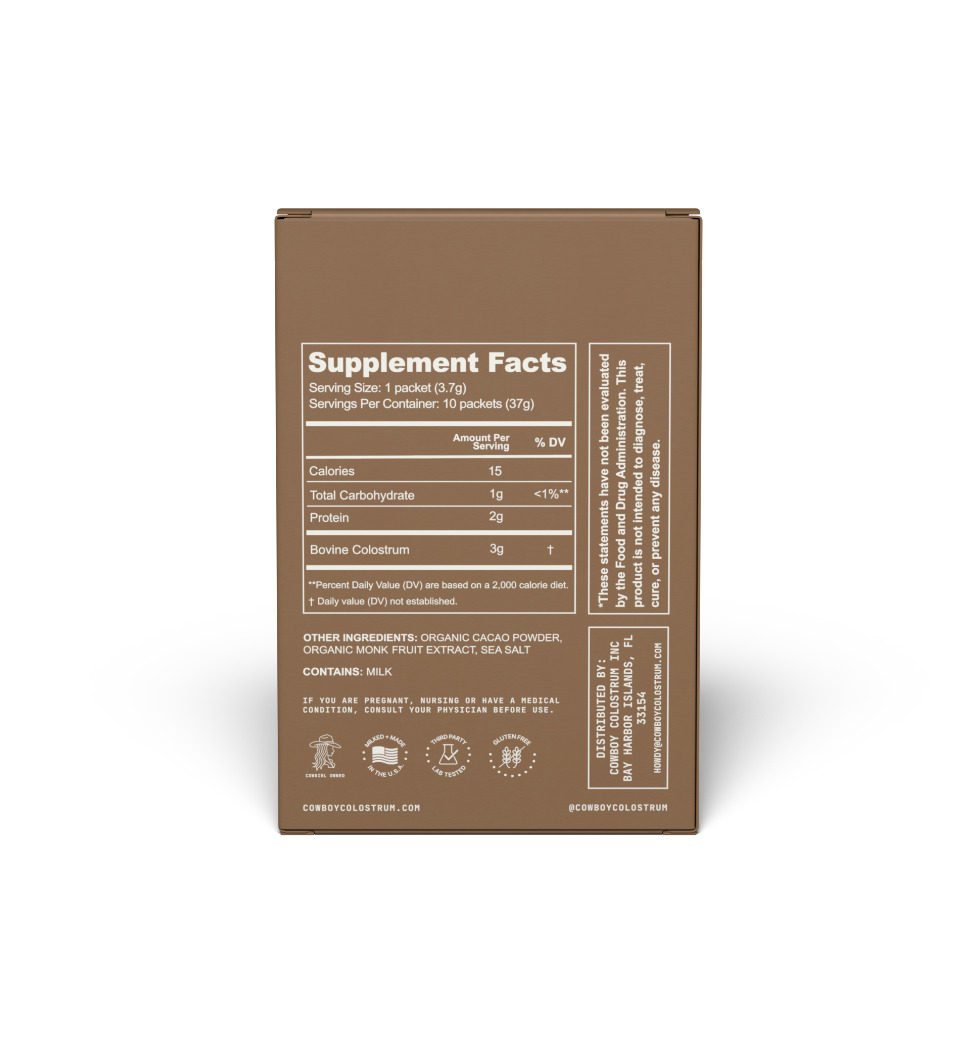 Grass-fed Bovine Colostrum, Organic Cacao Powder, Organic Monk Fruit Extract, Sea Salt. Contains: Milk.