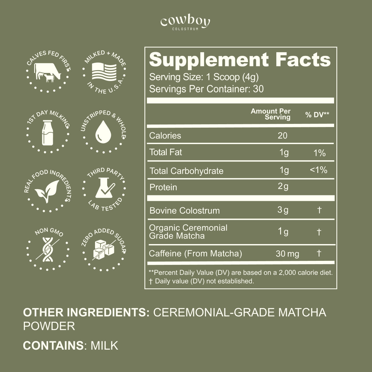 Grass-fed Bovine Colostrum, Ceremonial-Grade Matcha. Contains: Milk.
