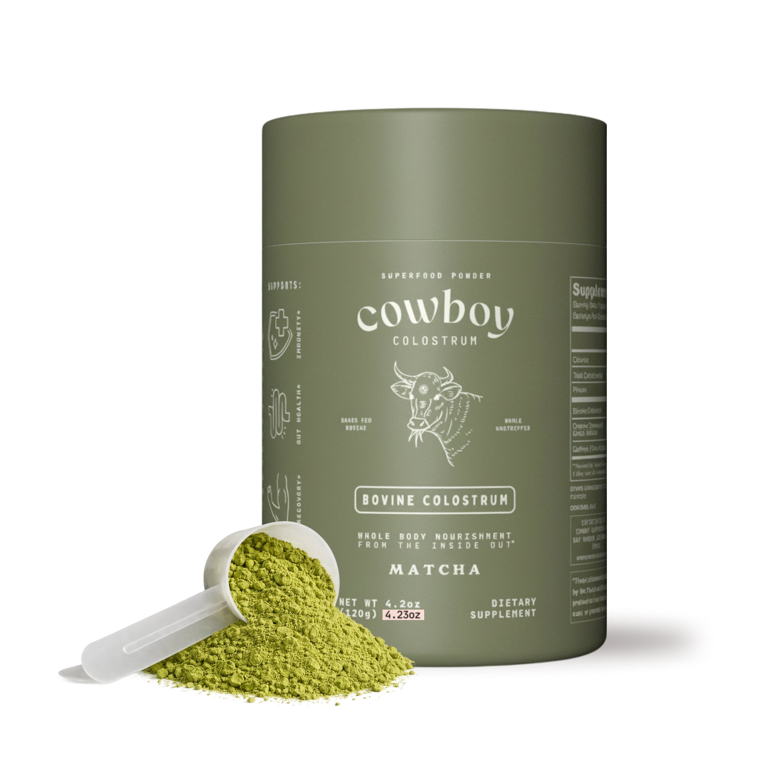 Grass-fed Bovine Colostrum, Ceremonial-Grade Matcha. Contains: Milk.