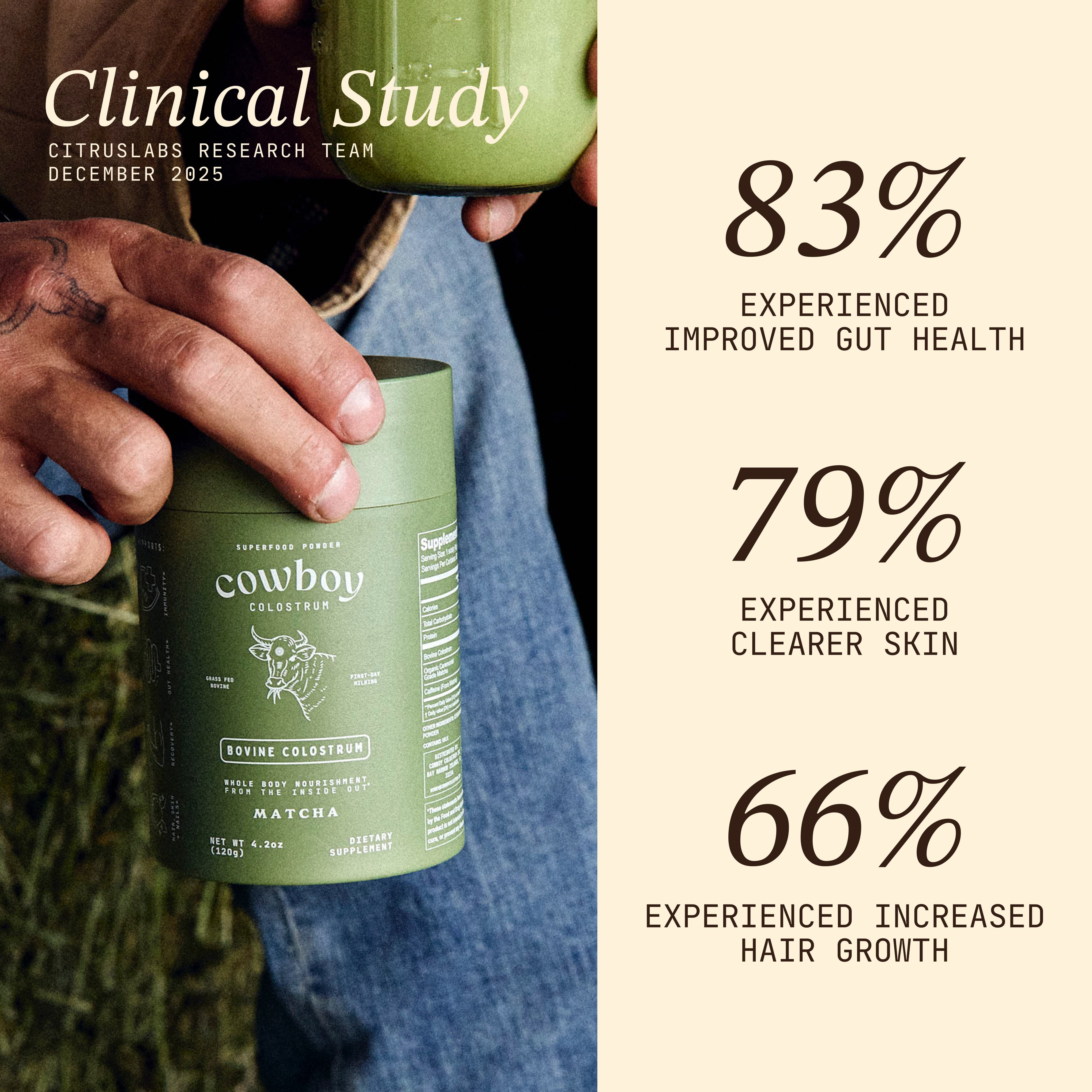 Cowboy Colostrum only sources first-day colostrum - collected within 24 hours after every calf is nourished - to preserve maximum bioactive potency. Our colostrum stays unstripped, whole, and as close to nature as possible. Unlike many brands that skim or strip fat, Cowboy keeps colostrum in its whole, full-fat form, maintaining all naturally occurring nutrients, peptides, and immune factors for optimal efficacy. Each serving delivers a robust 3 g dose - higher than most competitors - and comes in delicious, easy-to-mix flavors like vanilla, cacao, and unflavored.