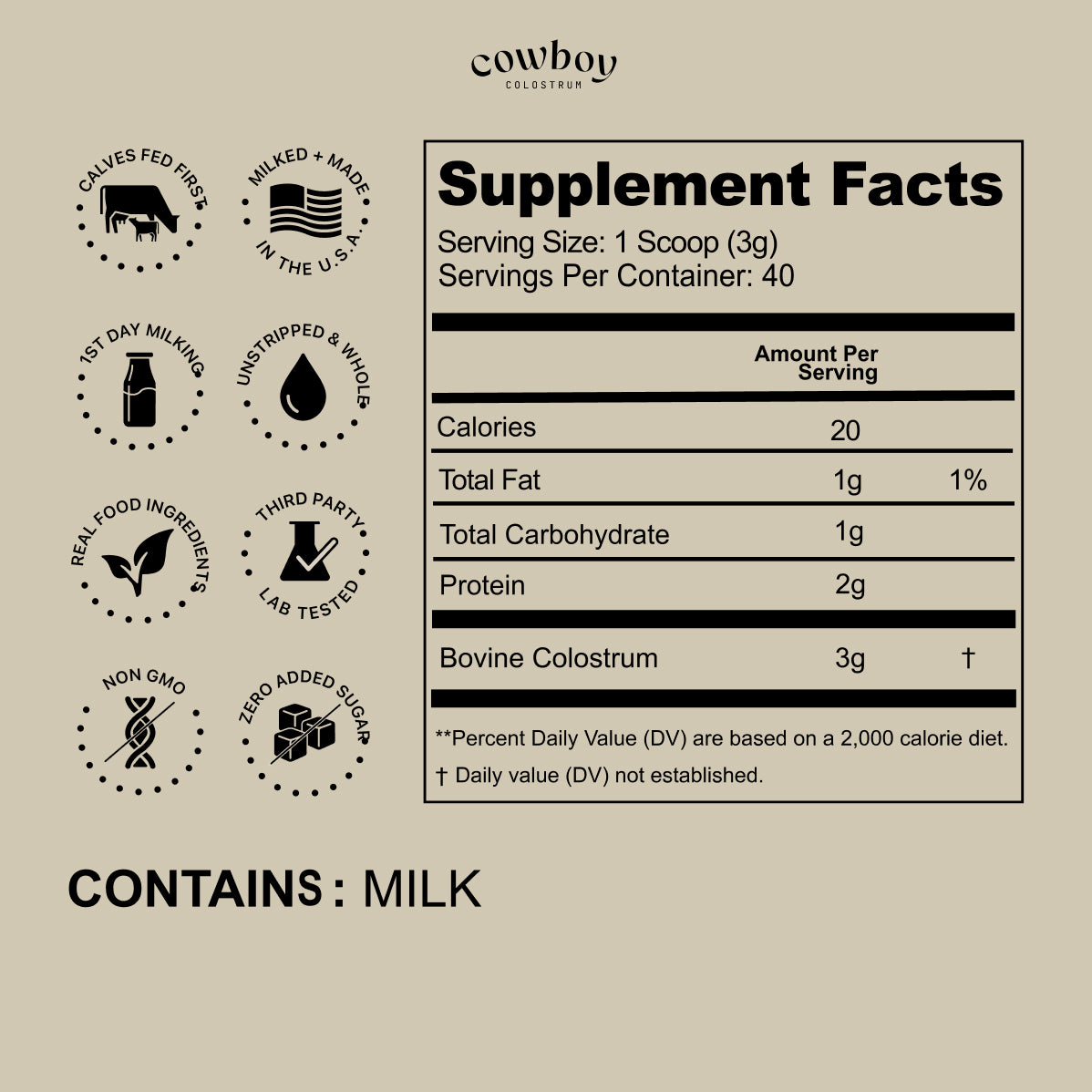 Research suggests that 3g of colostrum daily is a great starting dose. At 3g (1 scoop of Cowboy Colostrum) you’ll get meaningful levels of bioactive compounds that support whole-body health. If you’re trying to see faster results, or have an acute issue you’re trying to resolve, we recommend you take a hero’s does, 2-3 scoops of Cowboy per day (6-9g).
