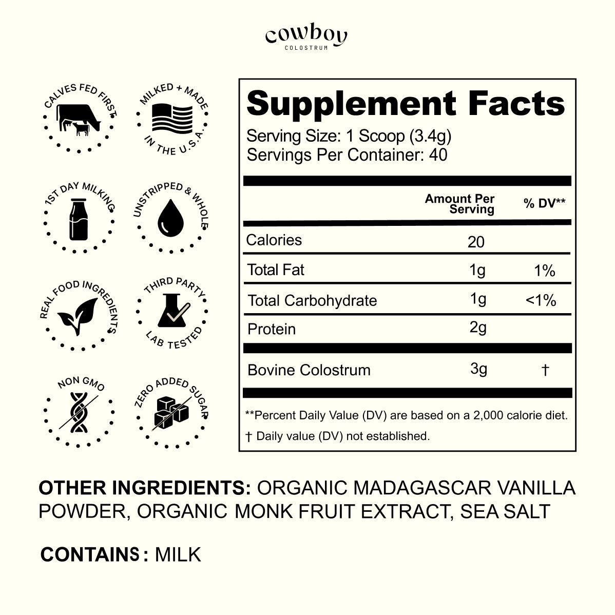 Grass-fed Bovine Colostrum, Organic Madagascar Vanilla Powder, Organic Monk Fruit Extract, Sea Salt. Contains: Milk.