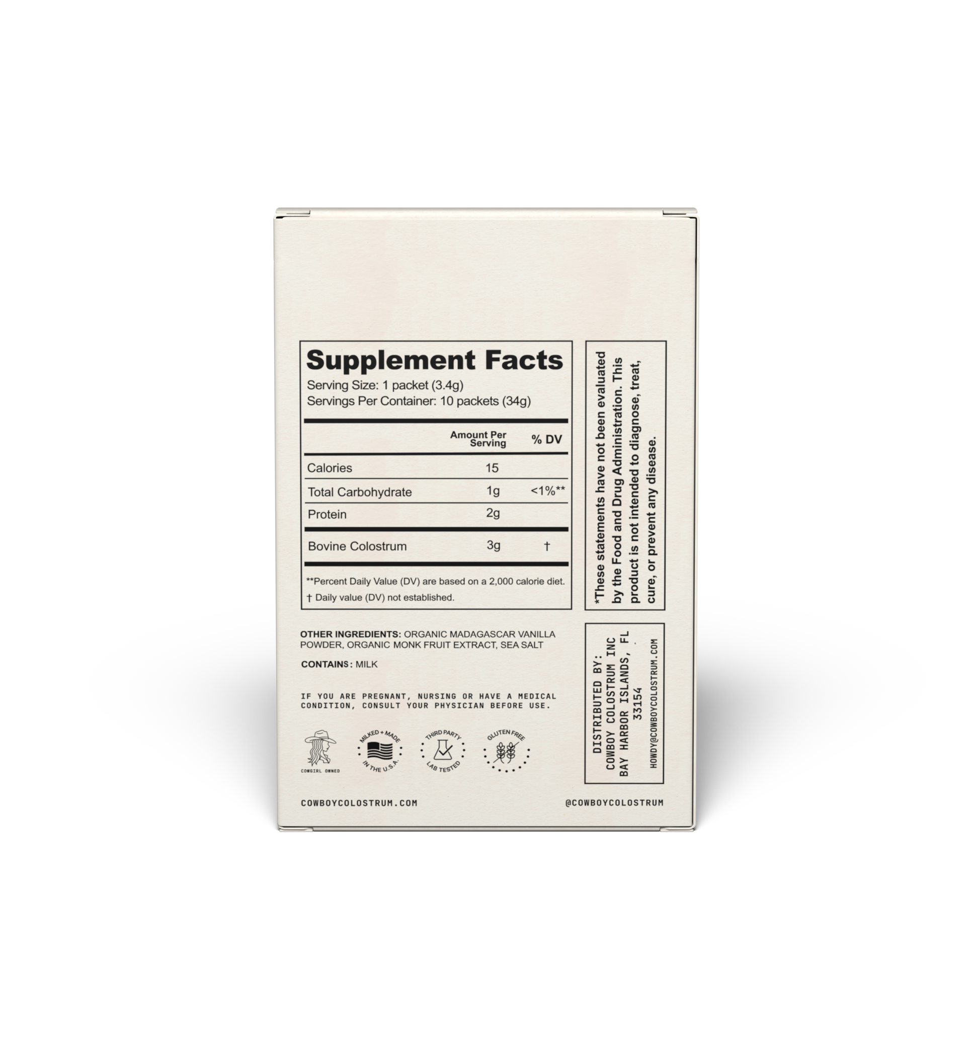Cowboy Colostrum only sources first-day colostrum - collected within 24 hours after every calf is nourished - to preserve maximum bioactive potency. Our colostrum stays unstripped, whole, and as close to nature as possible. Unlike many brands that skim or strip fat, Cowboy keeps colostrum in its whole, full-fat form, maintaining all naturally occurring nutrients, peptides, and immune factors for optimal efficacy. Each serving delivers a robust 3 g dose - higher than most competitors - and comes in delicious, easy-to-mix flavors like vanilla, cacao, and unflavored.