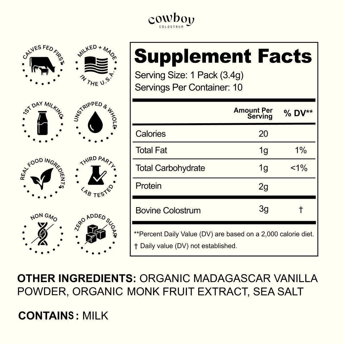 Cowboy Colostrum only sources first-day colostrum - collected within 24 hours after every calf is nourished - to preserve maximum bioactive potency. Our colostrum stays unstripped, whole, and as close to nature as possible. Unlike many brands that skim or strip fat, Cowboy keeps colostrum in its whole, full-fat form, maintaining all naturally occurring nutrients, peptides, and immune factors for optimal efficacy. Each serving delivers a robust 3 g dose - higher than most competitors - and comes in delicious, easy-to-mix flavors like vanilla, cacao, and unflavored.