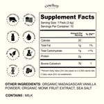 Our vanilla, chocolate, and strawberry colostrums are sweetened with monkfuit and flavored with real organic ingredients for flavor like organic Madagascar vanilla powder, cacao powder, and freeze-dried strawberries.