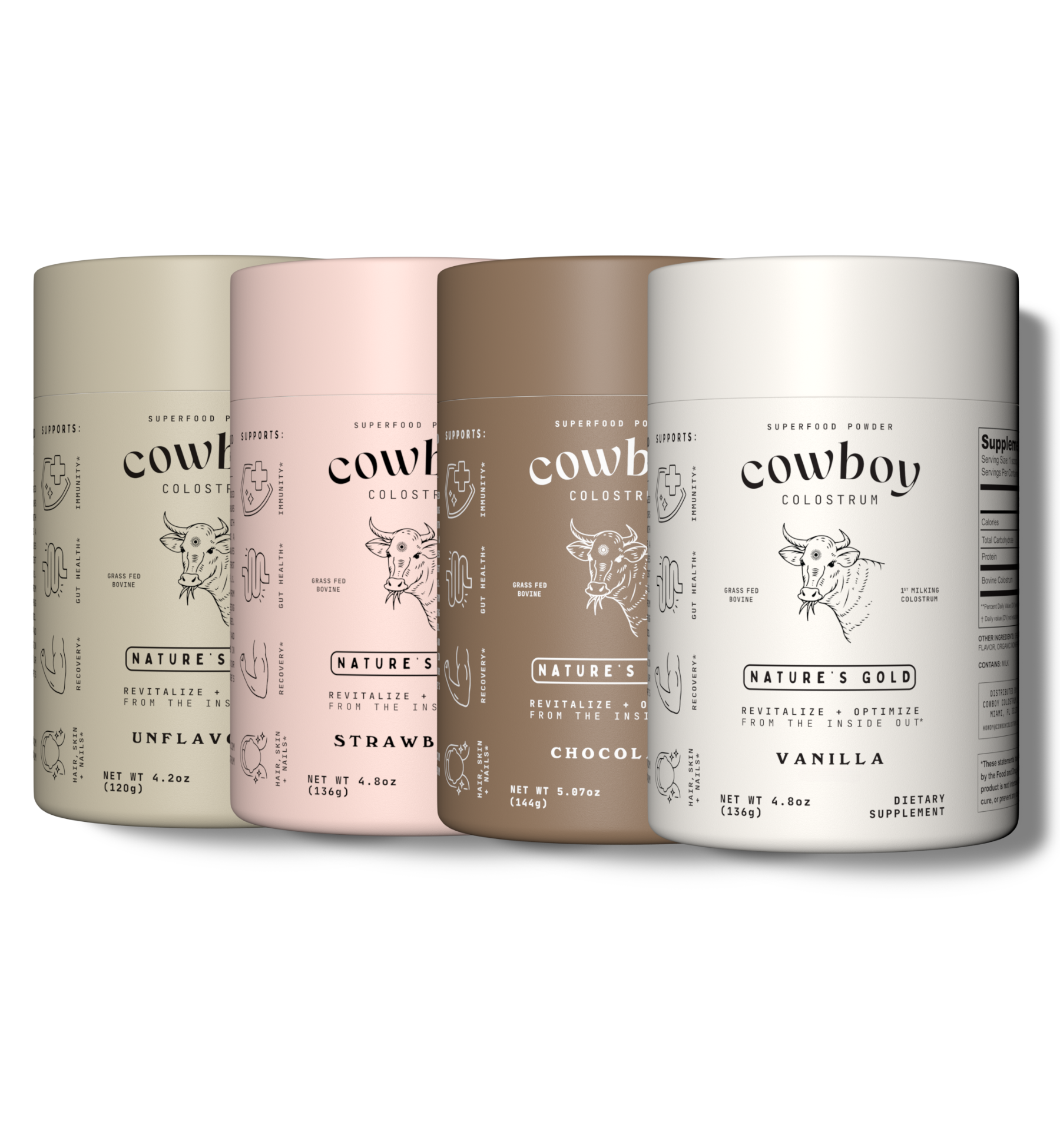 Enjoy Cowboy Colostrum in our four core flavors: vanilla, chocolate, strawberry and unflavored - crafted to bring you closer to the land, the herd, and your best self.