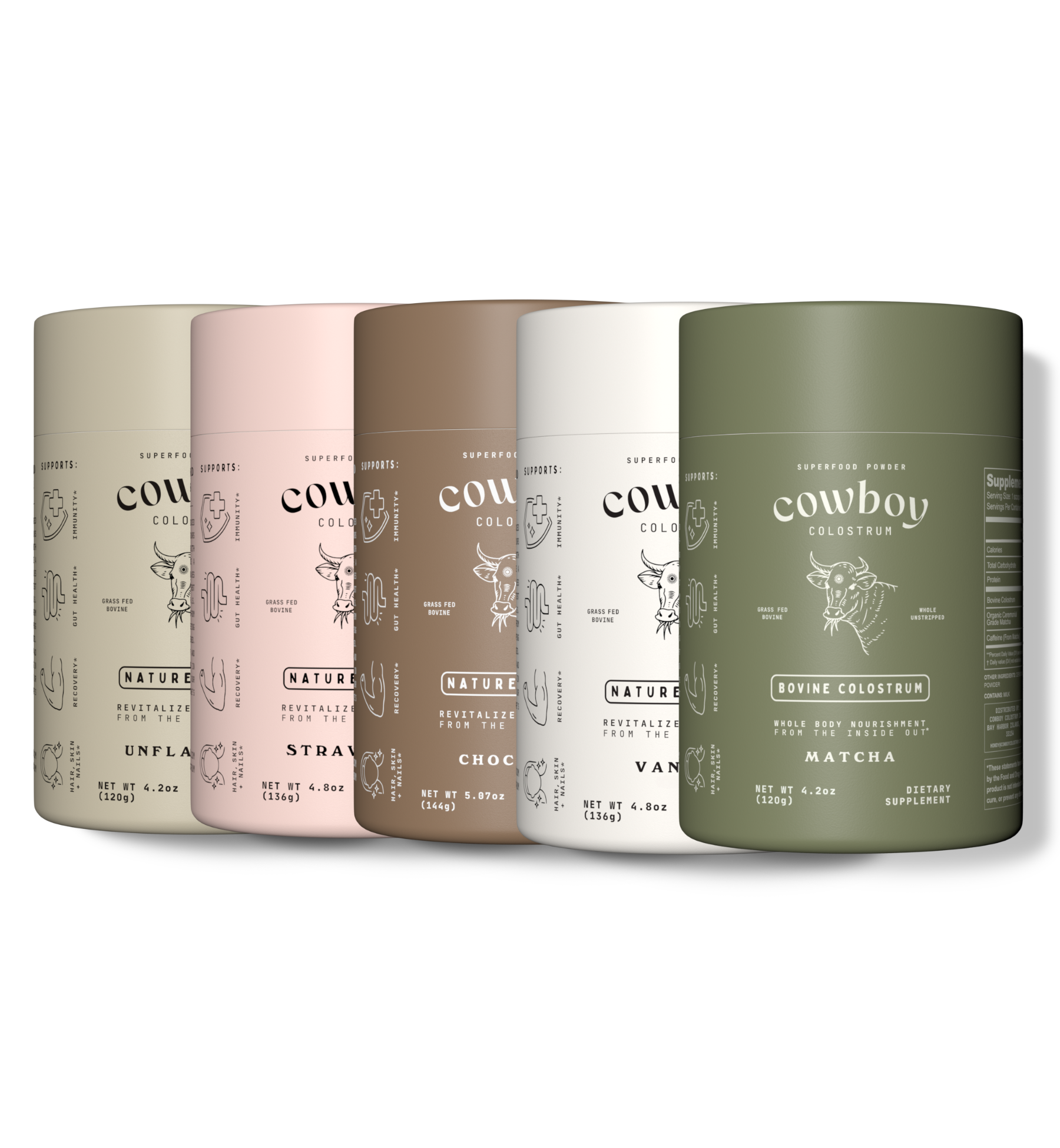 Enjoy Cowboy Colostrum in our five core flavors: matcha, vanilla, chocolate, strawberry and unflavored - crafted to bring you closer to the land, the herd, and your best self.